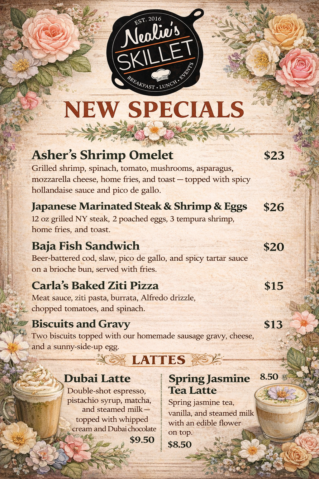 Chilaquiles 1/2 Tray - Homemade red salsa, scrambled egg, soy chorizo,corn tortilla chips, pico de gallo, cotija cheese, Colby cheese, crema topped with 4 fried eggs - $28.00